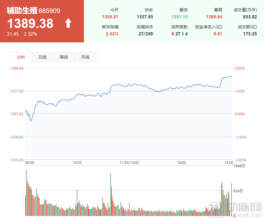 而港股方面,其中生殖遗传龙头企业锦欣生殖涨幅甚至超过22%,放量成交3800万股,1分钟成交逾300万;其余国内涉及辅助生殖领域的个股,例如贝康医疗也直线拉升15%,市值达到77亿港元。