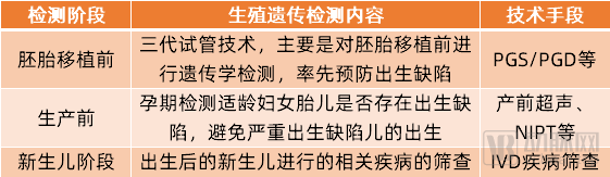 其中,提及的“提高优生优育服务水平”背后离不开生殖遗传IVD产业的支持。在IVD生殖遗传的细分市场里,提高优生优育的手段可以根据遗传检测的阶段不同,分为三级预防:胚胎移植前、生产前、新生儿阶段。