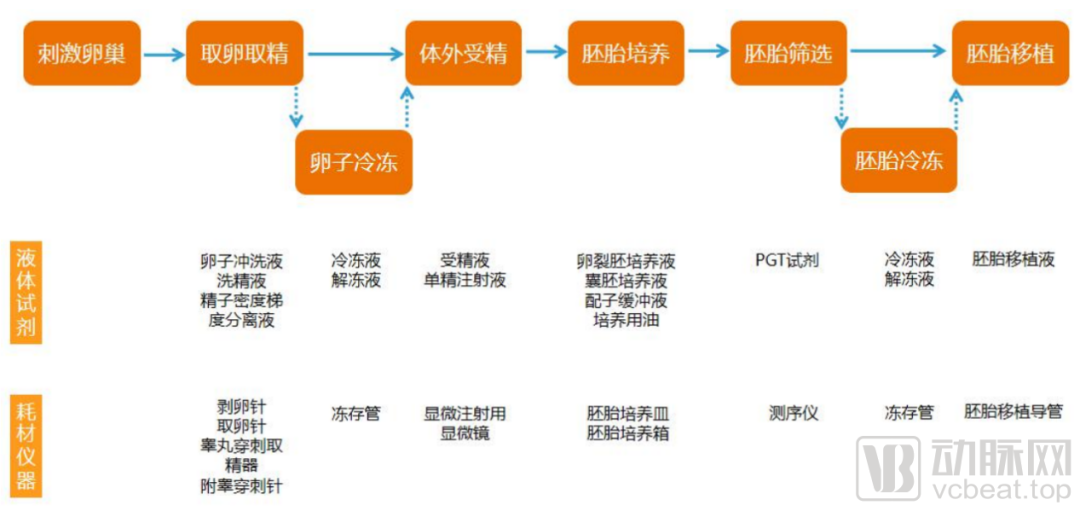 这部分辅助生殖服务主要包括刺激卵巢、取卵取精、卵子冷冻、体外受精、胚胎培养、胚胎筛选、胚胎冷冻以及胚胎植入,各项服务需要配套医疗器械,如辅助生殖用液、检测试剂、固体耗材及仪器等。