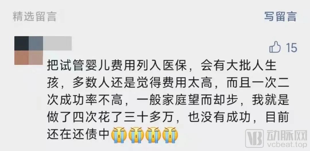 “把试管婴儿费用列入医保,会有大批人生孩,多数人还是觉得费用太高,而且一次二次成功率不高,一般家庭望而却步,我就是做了四次花了三十多万,也没有成功,目前还在还债中。”在此前动脉网发布的《出生率跌破1%,辅助生殖技术能缓解中国的人口形势吗?》一文中,有读者文末留言,针砭时弊指出辅助生殖技术缓解中国人口形式的根源在于,患者端的支付难题。