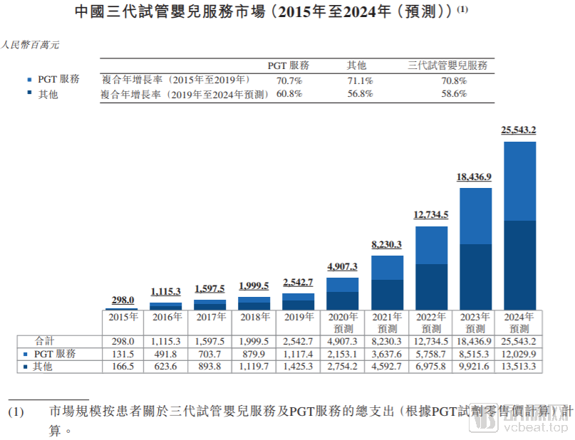 这些因素促使患者对三代试管婴儿服务的需求日益增长,其中包括医疗咨询、试管婴儿治疗(即卵子提取、受精、胚胎移植)、药物治疗和PGT。三代试管婴儿服务的规模(按患者的总支出计,包括注册费、咨询费、检查费、药费及PGT服务费)从2015年的人民币3亿元增加至2019年的人民币25亿元,预计将于2024年达到人民币255亿元。