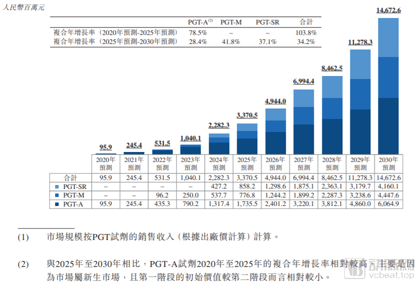 受商业推出PGT试剂所驱动,中国PGT试剂市场预期将在未来数年快速增长,其市场规模(按基于出厂价的销售收入计)从2020年的人民币0.96亿元增加至2025年的人民币34亿元,预计于2030年进一步增加至人民币147亿元。