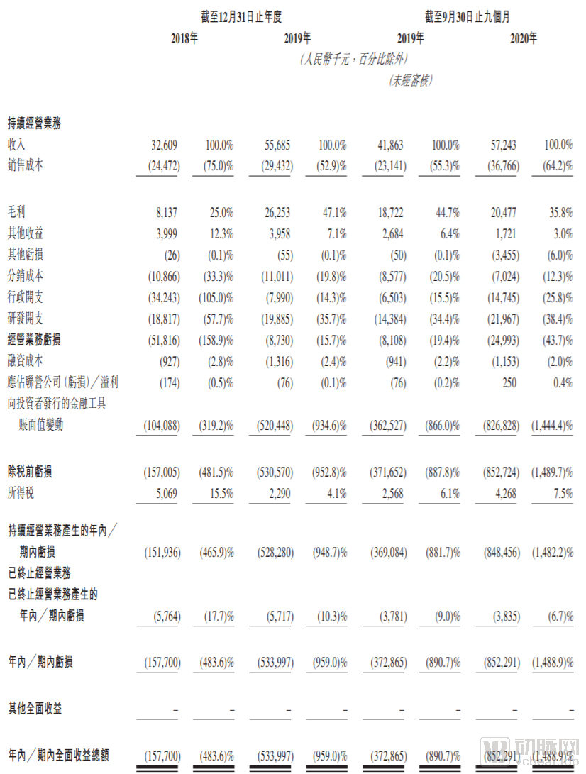 由于2020年之前产品尚未实现商业化,贝康医疗也持续处于亏损状态。2018年、2019年期内亏损分别为1.58亿、5.34亿;2020年前9个月亏损8.52亿元,2019年同期亏损为3.73亿元。