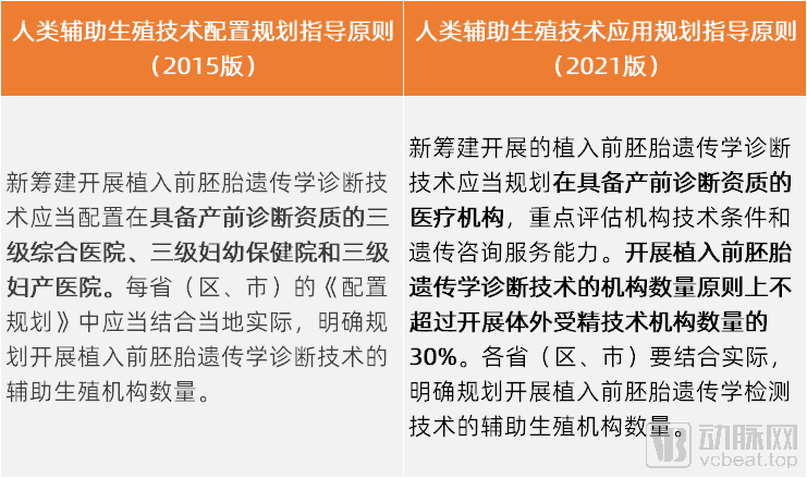 同时,2021年国家卫健委制定了《人类辅助生殖技术应用规划指导原则(2021版)》,在2015年版的基础上调整了开展植入前胚胎遗传学诊断技术的要求,取消了三级医疗机构的限制。