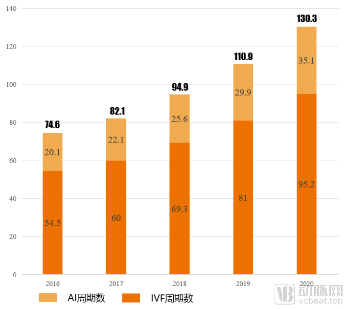 《Reproductive Biology and Endocrinology》公布的数据中,国内医生人工授精和试管婴儿的选择比例约为7:19,而且通常在人工授精2—3次未能受孕的情况下会选择试管婴儿。因此,试管婴儿是ART市场的主导力量。截止2020年年底,国内ART服务总周期数为130.3万例,其中试管婴儿周期数为95.2万例,人工授精周期数为35.1万例,2016~2020年ART服务总周期数CAGR高达15%。