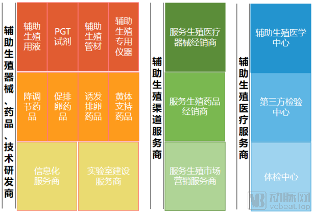辅助生殖产业链的上游为器械、药品和技术研发商,中游为器械、药品经销以及市场营销渠道商,下游为辅助生殖医疗服务商。上游企业主要解决辅助生殖服务所需的医疗器械、药品和技术,中游企业主要解决辅助生殖产品的供应和患者的触达,下游企业则主要完成辅助生殖医疗服务,帮助不孕不育患者成功受孕。可以看到,经过多年的发展,整个辅助生殖行业建立了明确的分工体系。