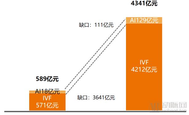 根据实地调研访谈,IVF每个周期的费用约6万元,AI每个周期的费用约0.5万元。目前960万对不孕不育夫妇人群需要ART服务,IVF和AI的选择比例为19:7,则IVF的市场需求规模在4212亿元,AI的市场需求规模在129亿元,整个ART市场需求规模达到4341亿元。而Frost & Sullivan公布2020年国内IVF服务规模为571亿元,AI的服务规模为18亿元,ART总服务规模为589亿元,这意味着国内还有3752亿元的潜在市场空间(其中IVF缺口3641亿元,AI缺口111亿元)。