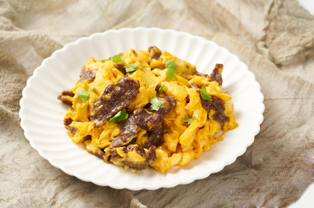 锅中留少许油烧至温热,倒入以拌匀蛋液的牛肉,边炒边加油,炒至蛋液还没完全凝固时关火,最后淋入芝麻油炒匀即可出锅。