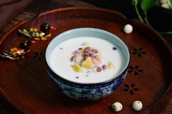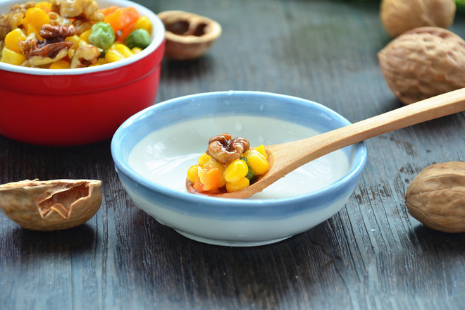 将玉米汁过滤,往玉米汁里注入牛奶。加核桃碎即成。
